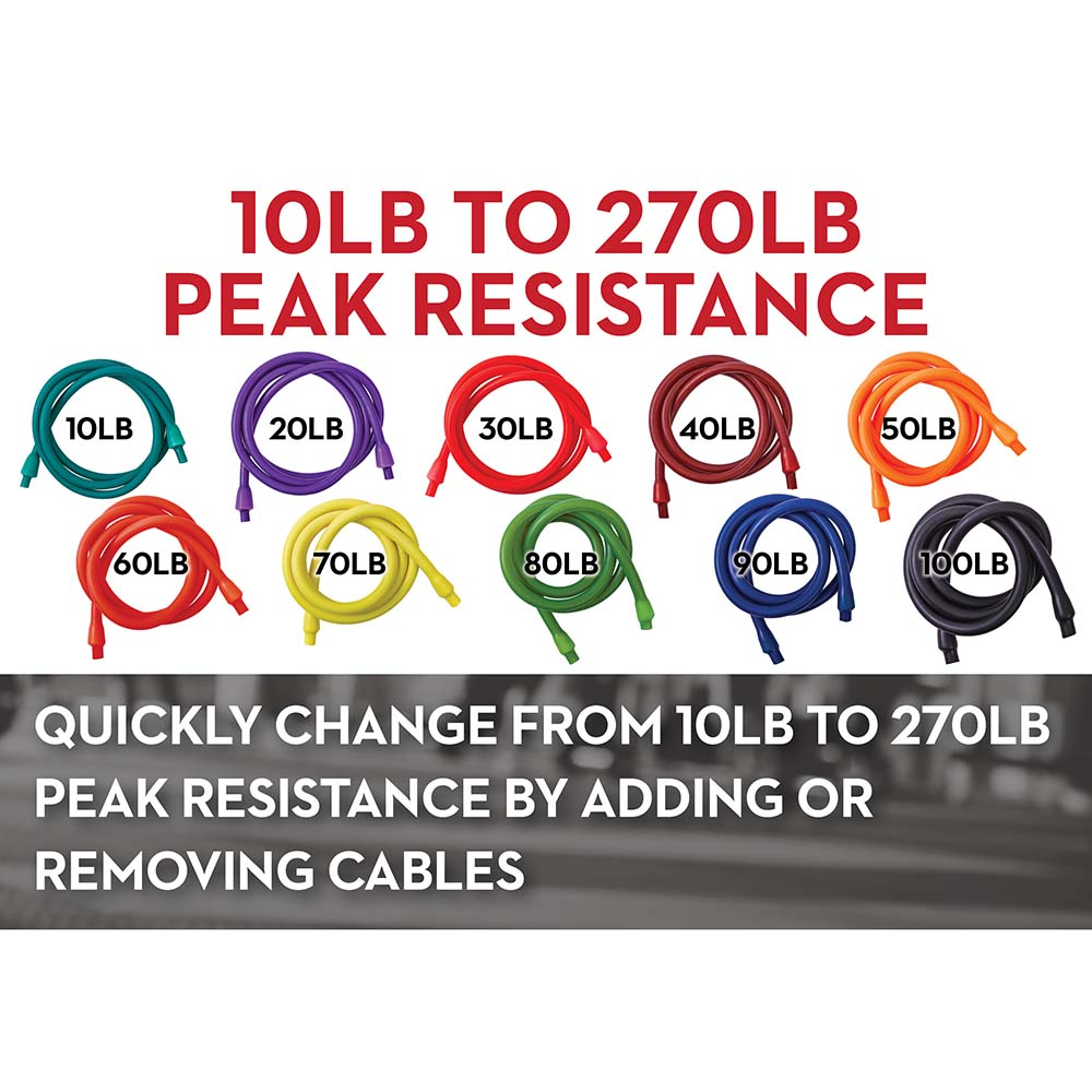 - Pro Kit includes 10-60lbs in resistance cables in 10lb increments, a pair of triple grip handles, and two door anchors. Ultimate Kit includes 10-100lbs in resistance cables in 10lb increments, pairs of both triple grip and single grip handles, and two door anchors.
